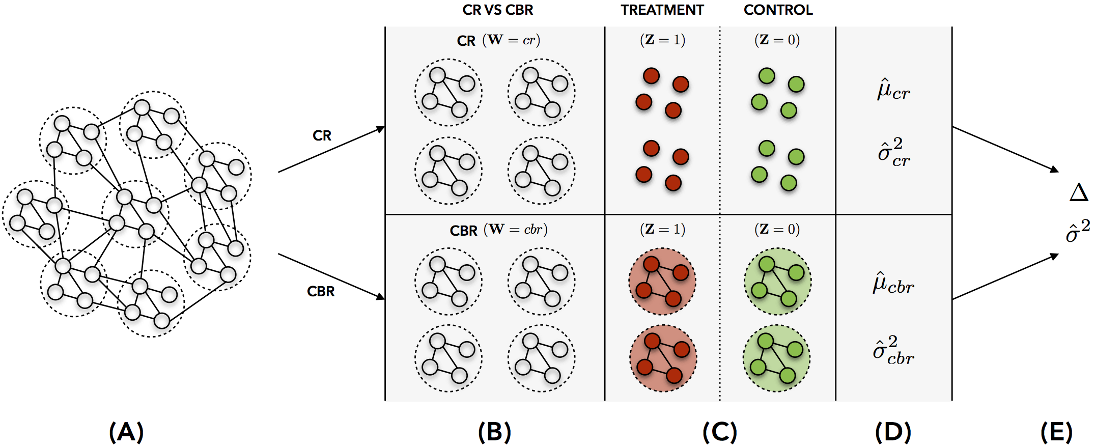 (B) Assigning clusters to treatment arms: completely randomized (CR) and cluster-based randomized assignment (CBR).